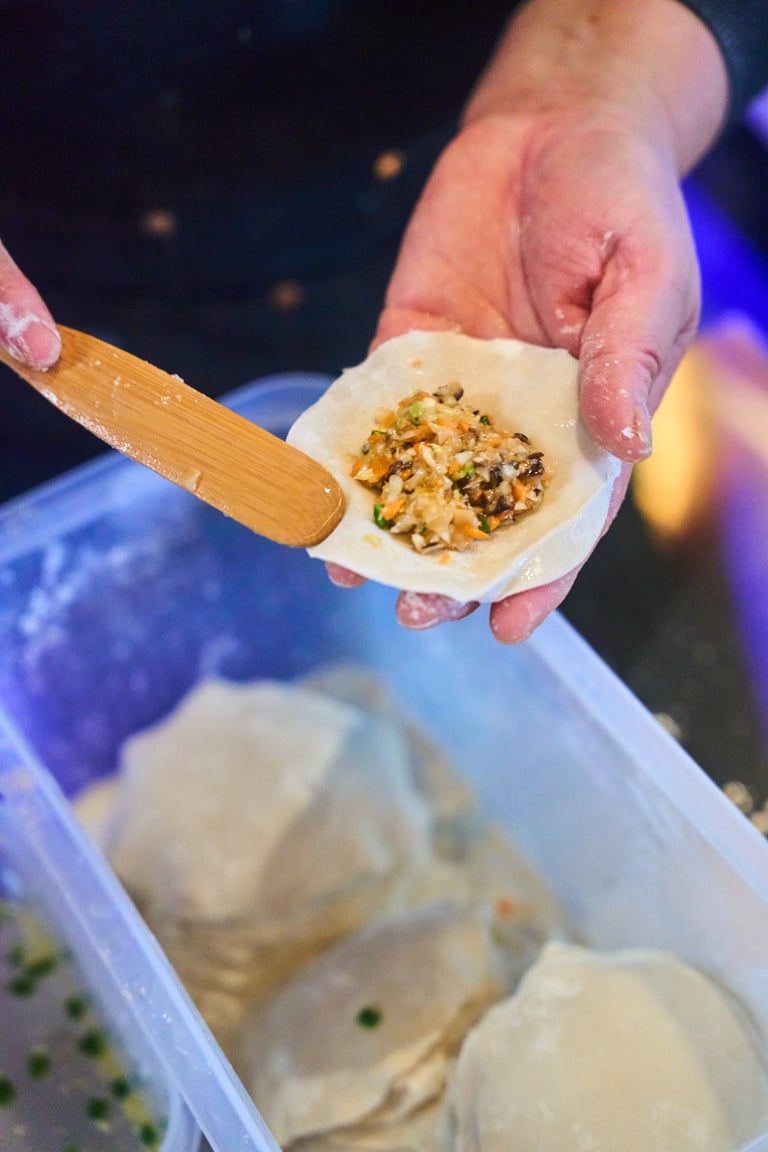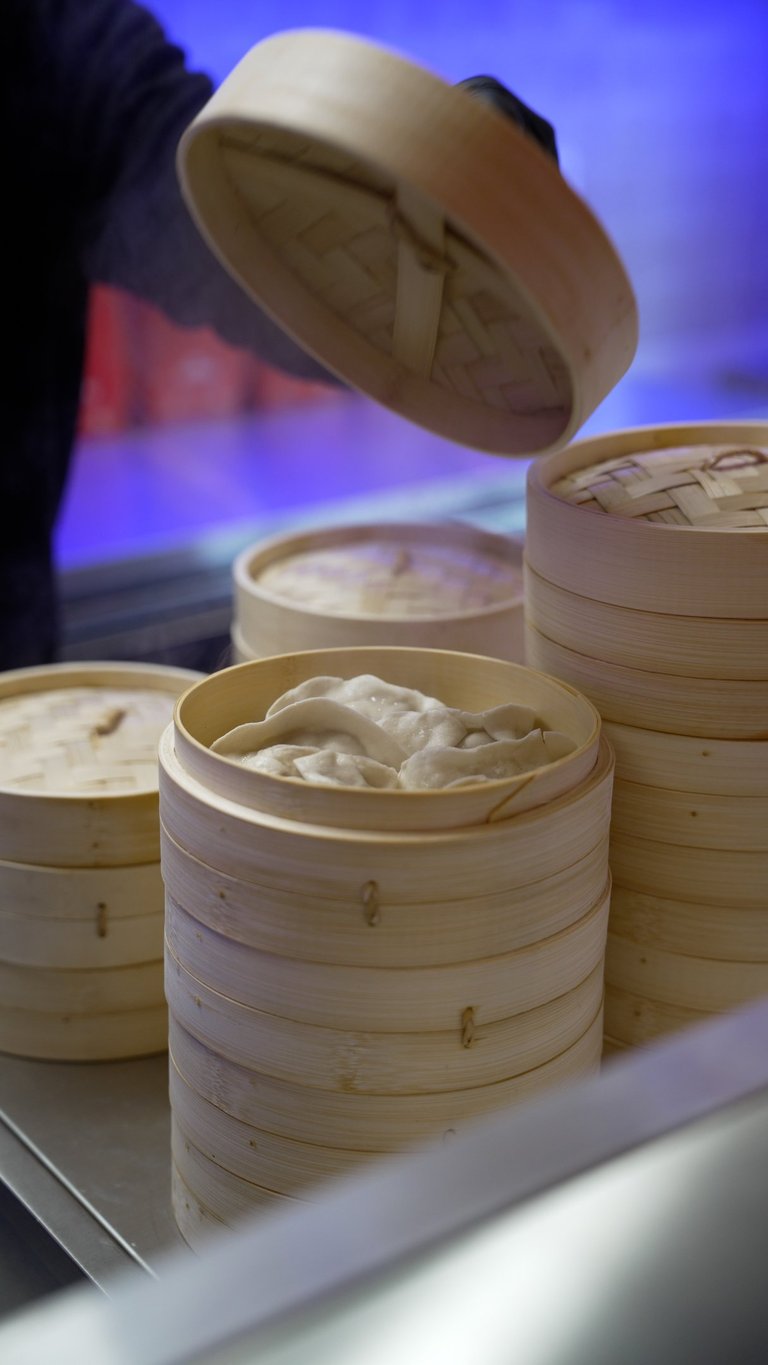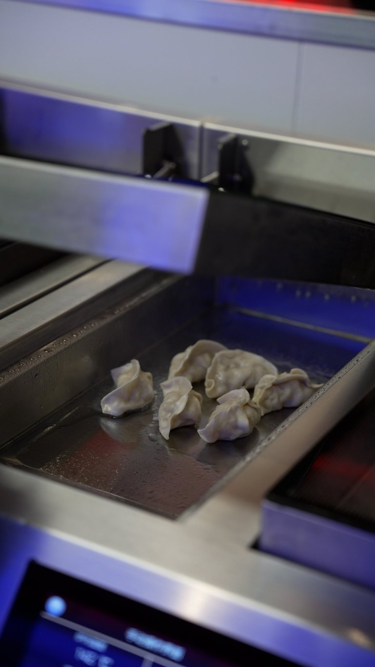 A diferencia de muchos dumplings chinos que solo se hacen al vapor, lo auténtico primero se tuesta en la plancha (para que la base quede crujiente y dorada) y luego se le añade agua para terminarla al vapor. Ese contraste de texturas (tostado abajo, tierno arriba) es lo que vuelve loca a la gente.